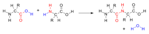 A peptide is a biologically occurring chemical compound containing two or more amino acids connected to one another by peptide bonds. A peptide bond is a covalent bond that is formed between two amino acids when a carboxyl group or C-terminus of one amino acid reacts with the amino group or N-terminus of another amino acid in a condensation reaction (a molecule of water is released during the reaction). The resulting bond is a CO-NH bond and forms a peptide, or amide molecule. Likewise, peptide bonds are amide bonds.